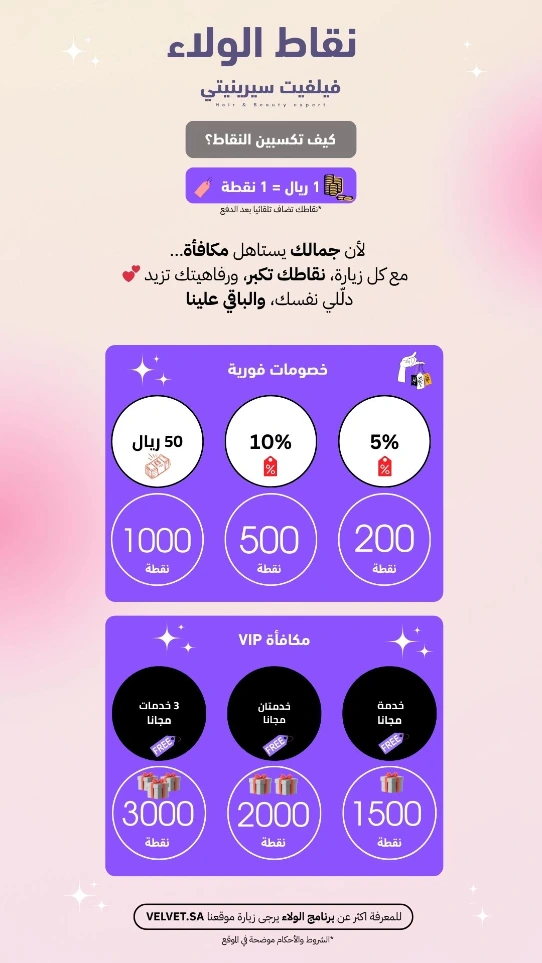 في Velvet Serenity نؤمن إن الجمال مو مجرد خدمة، هو تجربة، وولاؤك لنا يستاهل تقدير حقيقي. ومن هنا صممنا برنامج الولاء ليكون أقرب لقلبك، واضح، وفخم مثل ذوقك.